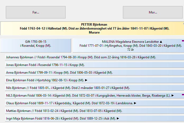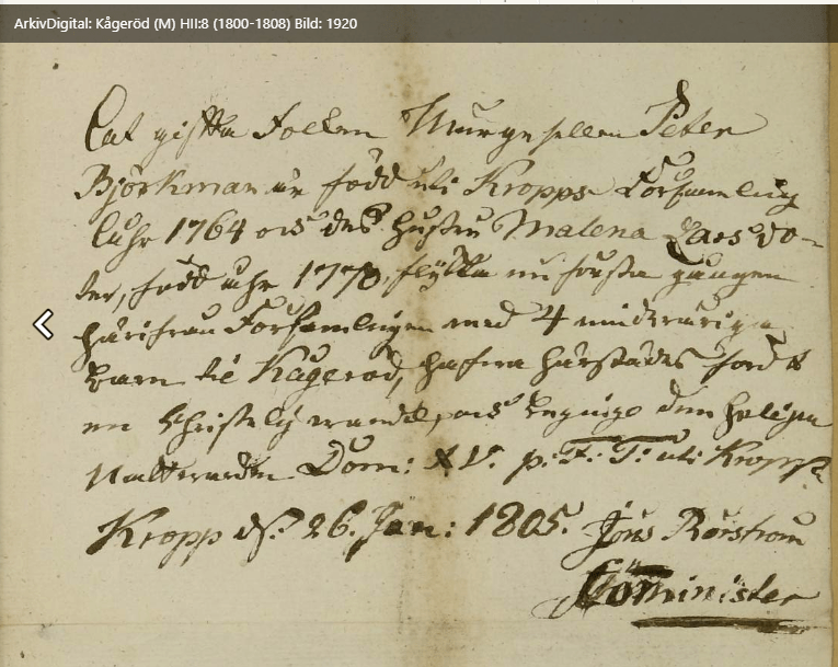Den tidigaste Björkman släktingen som jag har hittat i arkiven är Petter Björkman som föddes 1764 i Kropp utanför Helsingborg.